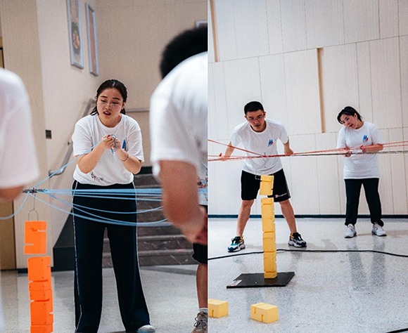教练们将一天的活动安排地满满,每个活动都紧张、刺激、有趣。其中“合力筑塔”是让人印象最深刻的项目,在这项目中,队员们必须保持绝对的一致性与专注力,听从指挥,才能合力将塔筑好。任何一丝抱怨、放松都有可能导致功亏一篑,出现问题大家一起解决,不能相互指责,更不能半途而废。四组在第一次筑了5层塔时由于失误导致塔倒塌,有了放弃的念想,但在教练的鼓励下选择了重头再来,大家一步一个脚印,通力合作,最终绝地反击获得了第一名。